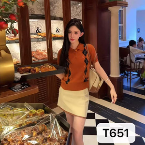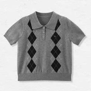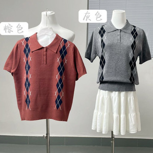 菱格翻领撞色短袖百搭气质POLO领上衣女装工厂外贸跨境毛织针织衫