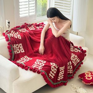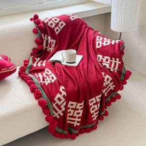 囍字手工针织玫瑰花束毯子结婚订婚送礼毛毯披肩毯休闲设计感盖毯