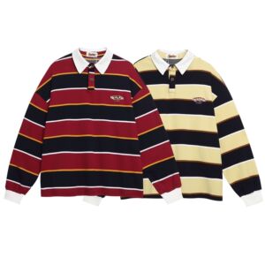 美式复古条纹翻领polo衫长袖T恤男女秋季宽松休闲百搭打底衫上衣