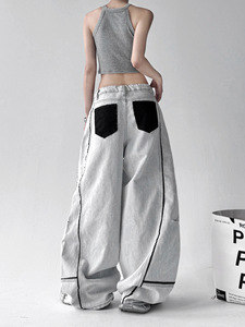 高街复古拼接撞色牛仔裤女2025年夏季新款高腰直筒宽松阔腿长裤子