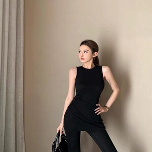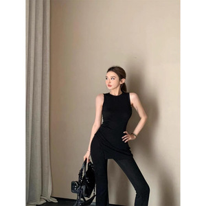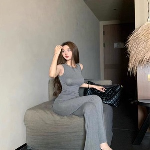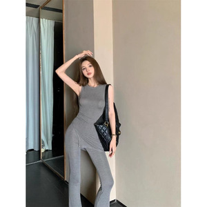 新品亚马逊欧美灰色开叉无袖小背心套装休闲修身微喇叭长裤两件套