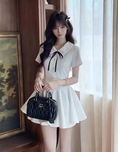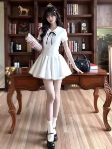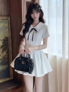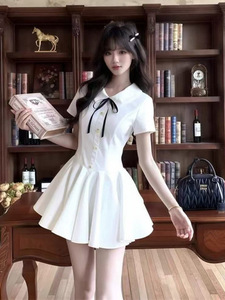 温柔感蝴蝶结娃娃领白色连衣裙女夏季学院风甜美收腰百褶a字裙子