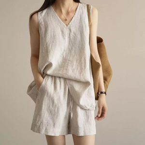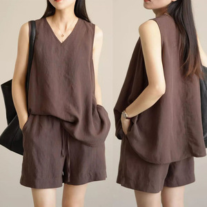 时尚休闲无袖短裤套装女2025夏季新款宽松大码V领纯色背心两件套