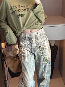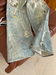 外贸跨境批发AC家新款1981蕾丝珍珠印花牛仔裤长裤男女同款南油