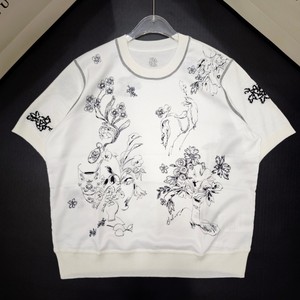 ES新款女装羊毛针梭拼接国风印花圆领针织短袖女真丝套头上衣