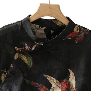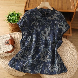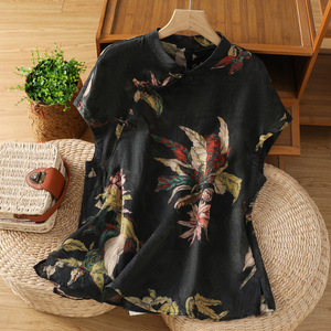 新中式棉麻上衣女夏季薄款苎麻印花小衫中年妈妈国风亚麻短袖衬衫