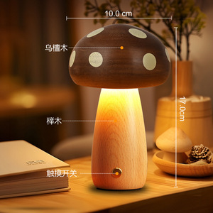 创意ins实木蘑菇小夜灯氛围灯床头灯摆件榉木儿童LED台灯女生礼物