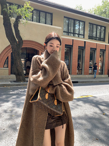 52026#大翻领长款开衫外套女冬季新款慵懒风针织衫宽松加厚毛衣
