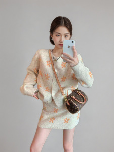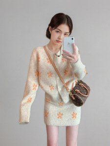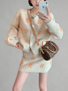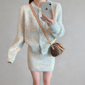 CEIIS外贸冬款针织开衫新款圆领套头上衣半身短裙两件套装毛衣女