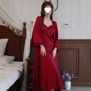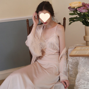 高级感冰丝绸长款睡裙女夏法式复古薄款仿真丝吊带裙睡袍套装春秋