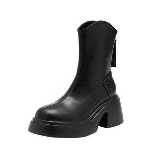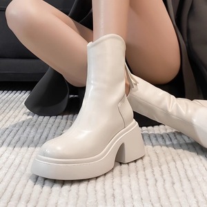 白色V口高跟短靴女秋冬款厚底增高弹力瘦瘦靴粗跟百搭显瘦短筒靴.