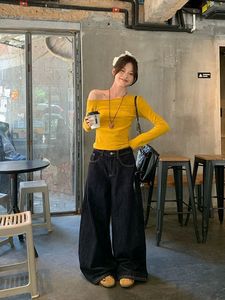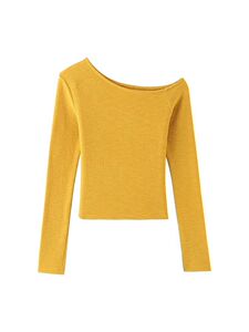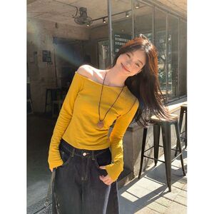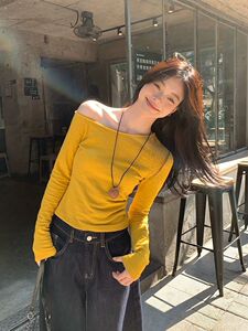 韩系黄色斜露肩长袖t恤女早秋季2025新款修身显瘦收腰甜辣妹上衣