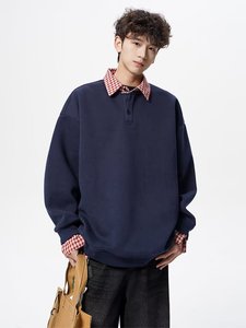 韩系假两件格子拼接长袖卫衣男士时尚学院风高街POLO领套头外套潮