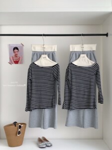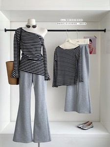 实拍2025早秋韩版不规则露肩条纹长袖针织上衣+韩版松紧腰微喇裤