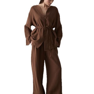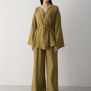 跨境欧美风纯棉高级感纯色简约女士睡衣V领长袖长裤两件套家居服