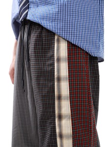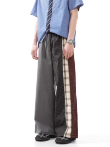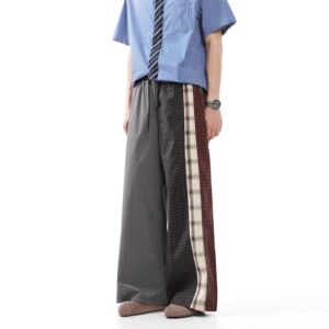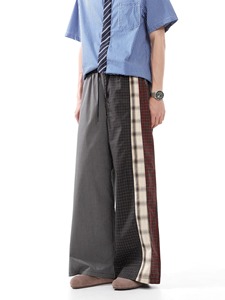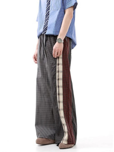 撞色拼接格子休闲裤男春秋新款不规则格纹松紧腰阔腿直筒长裤子潮