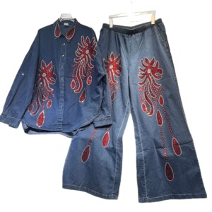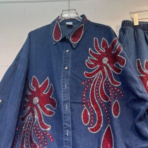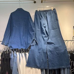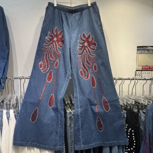 2025国潮设计感长袖牛仔衬衫上衣女重工烫钻设计松紧腰阔腿直筒裤
