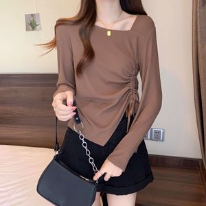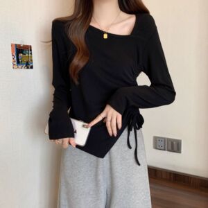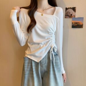 秋季大码女装斜领长袖T恤微胖妹妹不规则抽绳显瘦遮肉内搭上衣女