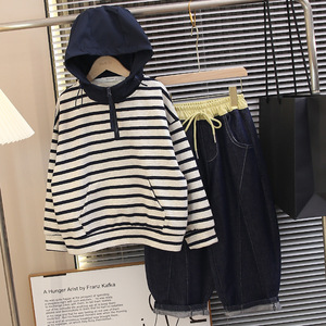 男童秋装连帽卫衣2025新款儿童春秋款条纹上衣帅气时髦男孩炸街潮