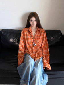 美式复古橙色格子长袖衬衫外套女春秋新款宽松百搭休闲高街衬衣潮
