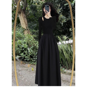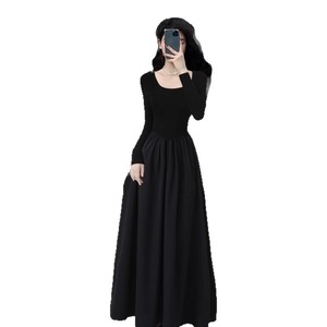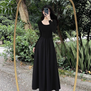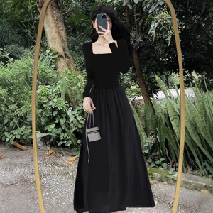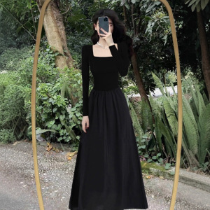 黑色茶歇法式连衣裙春装女2025年新款赫本风气质方领显瘦长裙女装