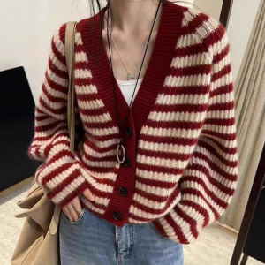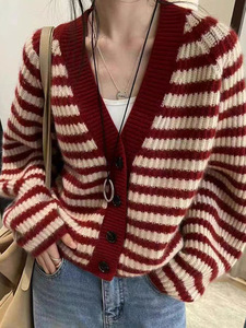 慵懒风复古红色条纹V领毛衣外套女冬季韩系软糯宽松针织开衫上衣