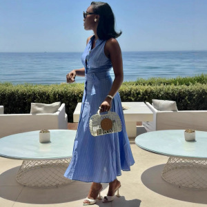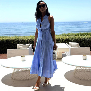欧美女装新款条纹翻领单排扣无袖系带修身长裙非洲时尚气质连衣裙