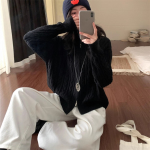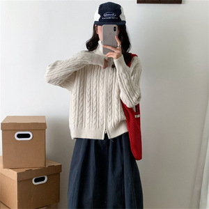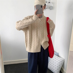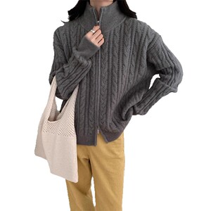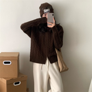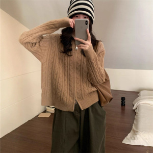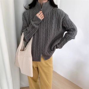 简约纯色麻花立领拉链毛衣外套女秋冬新款慵懒风宽松针织开衫上衣