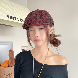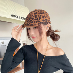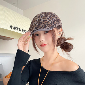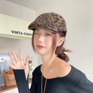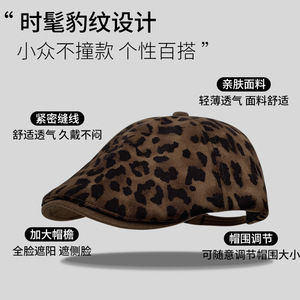 复古辣妹豹纹前进帽女秋冬大头围百搭显脸小画家帽遮阳贝雷鸭舌帽