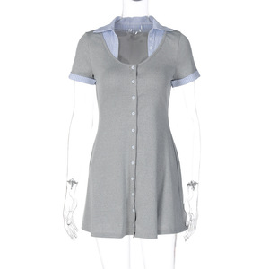 速卖通女装2025秋季新款时尚开衫纽扣拼接撞色短袖连衣裙外贸批发