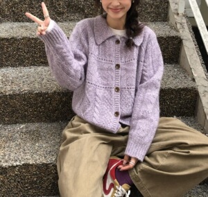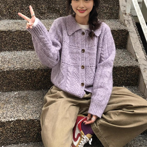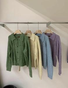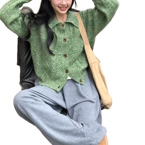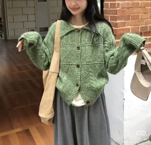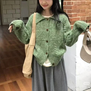 高品质花线慵懒松弛感穿搭草绿色翻领针织开衫女复古麻花毛衣外套