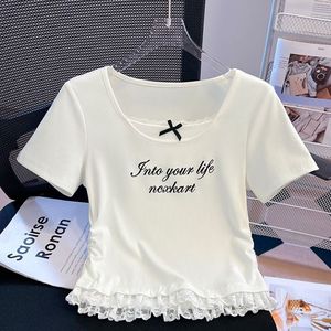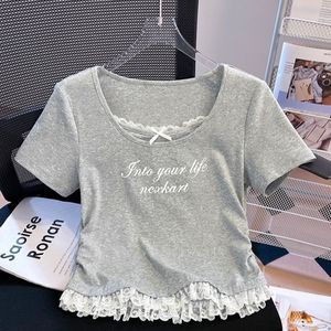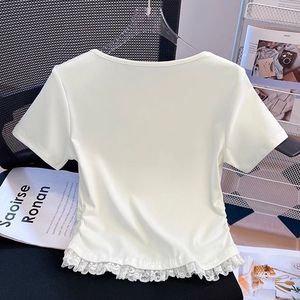 2025夏季新款蕾丝花边短袖t恤女正肩收腰显瘦修身短款假两件上衣