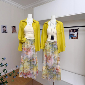 2025秋季新款时尚宽松防晒衬衫+修身吊带+碎花中长款半身裙三件套
