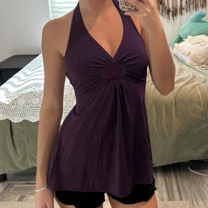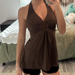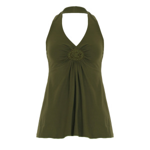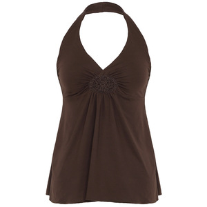 美式复古棕色刺绣贴交叉挂脖背心欧美早春新品V领美背打底衫上衣