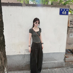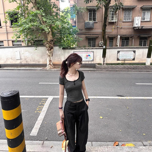 韩系复古条纹U领正肩短袖t恤女夏季2025新款修身收腰辣妹短款上衣