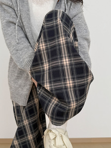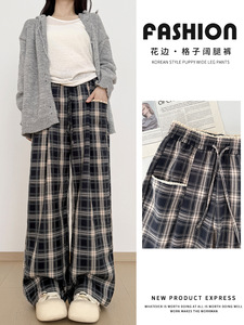 复古蕾丝花边格子裤女高腰显瘦直筒休闲女裤垂感宽松阔腿裤子