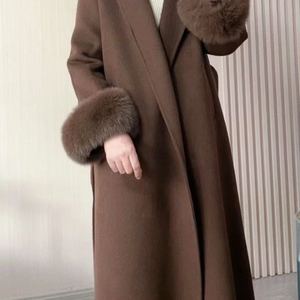 双面羊毛绒大衣狐狸毛袖浴袍款腰带高贵气质加长加厚毛呢外套女冬