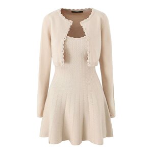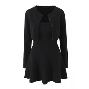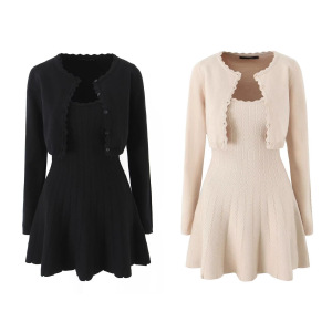 跨境外贸女装2025秋季欧美风修身针织连衣裙+破浪边开衫套装女M1