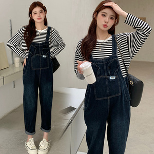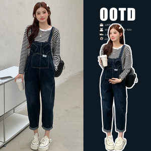 孕妇秋季新款韩版宽松休闲牛仔背带裤+条纹打底上衣潮妈显瘦套装
