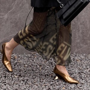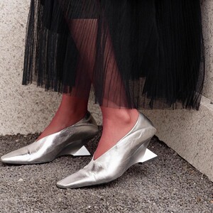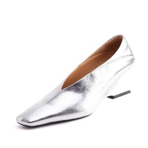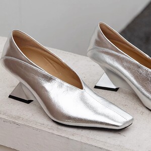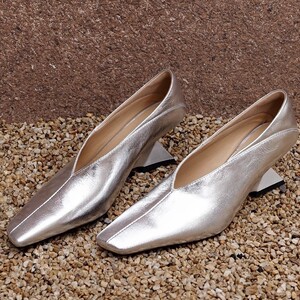 J225-2新款欧货高跟单鞋女浅口一脚蹬金银色方头V口坡跟奶奶鞋
