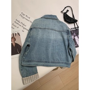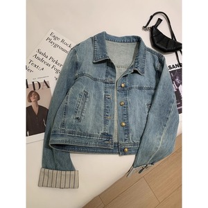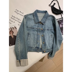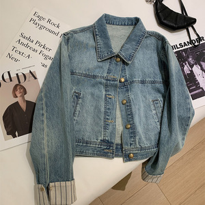 广州十三行高货爆款~格纹拼接袖短款牛仔外套宽松休闲小个子夹克