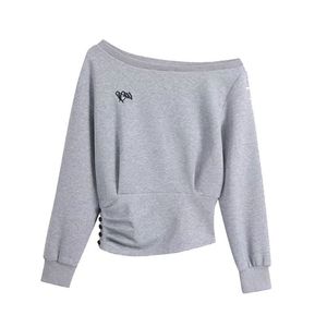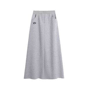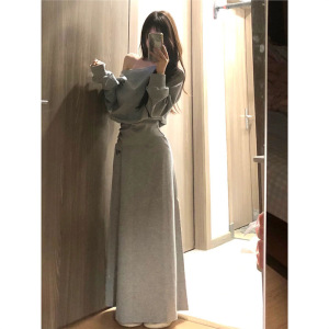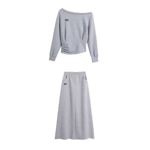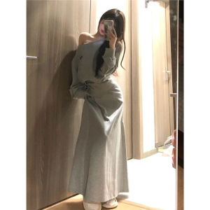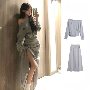 韩系辣妹刺绣斜肩长袖针织上衣套装女春夏气质高腰显瘦a字半身裙
