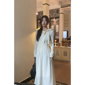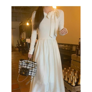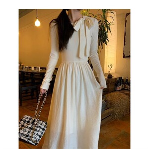 秦宿法式复古蝴蝶结设计感秋冬磨毛新款长袖连衣裙收腰温柔风长裙