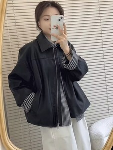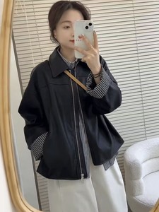 高级感拼接格子翻领黑色皮衣外套女春秋新款休闲百搭PU皮夹克上衣