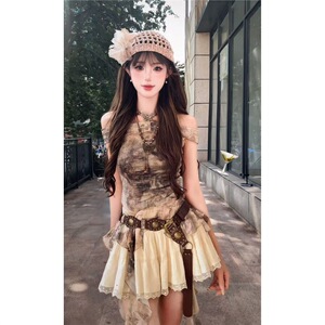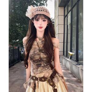 夏季复古废土风设计感一字肩印花上衣新款小众百搭显瘦半裙两件套