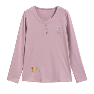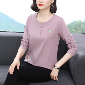 纯棉长袖圆领t恤女宽松妈妈洋气早秋刺绣秋衣2025年新款女装批发