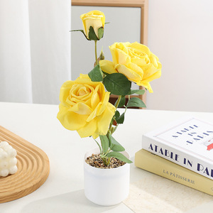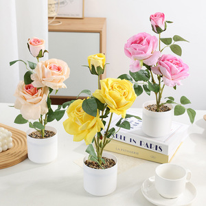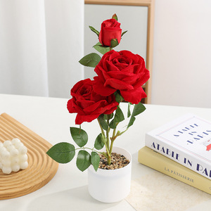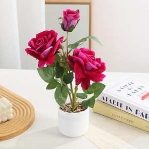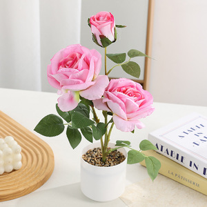 热卖爆款现货石子盆三头玫仿真植物玫瑰花仿真盆栽家居装饰ins风