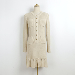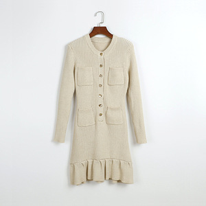 早秋款优雅圆领针织连衣裙单排扣四口袋荷叶边裙摆金线长袖中长裙