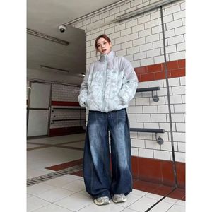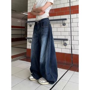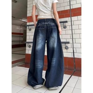 设计感刺绣拼接阔腿牛仔裤女欧美做旧水洗垂坠感直筒宽松弯刀长裤