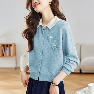 立体花朵拼色翻领针织开衫女2025新款春秋超好看外搭短款毛衣外套